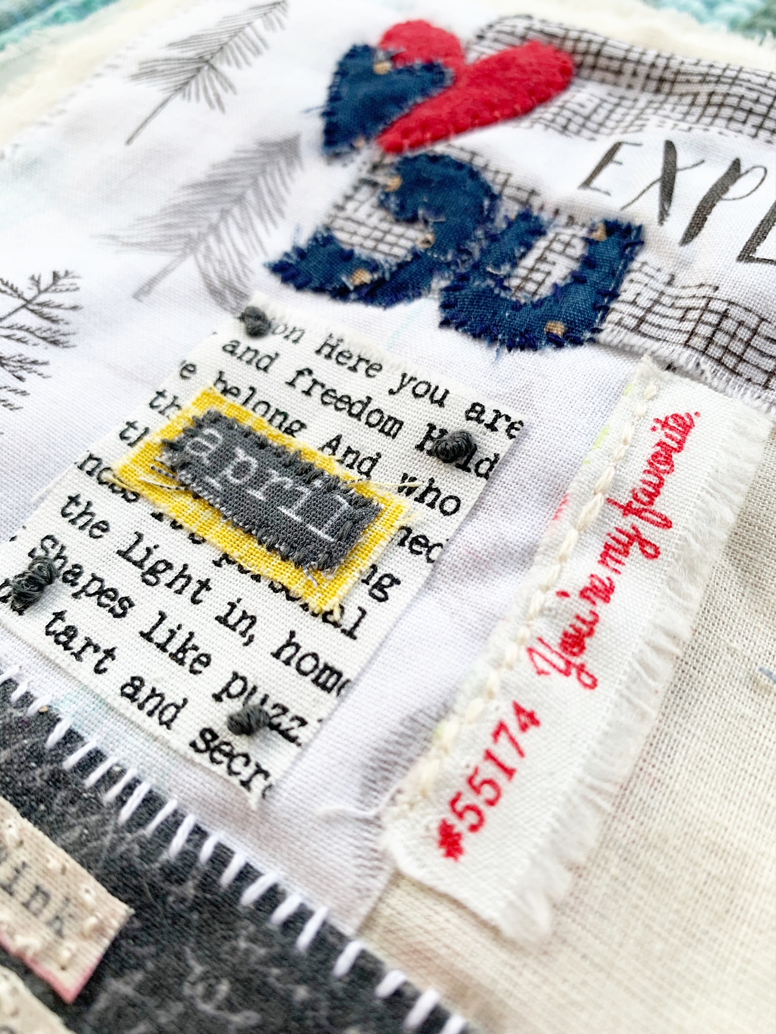 - Use your embroidery thread and needle to stitch the fabric collage together.