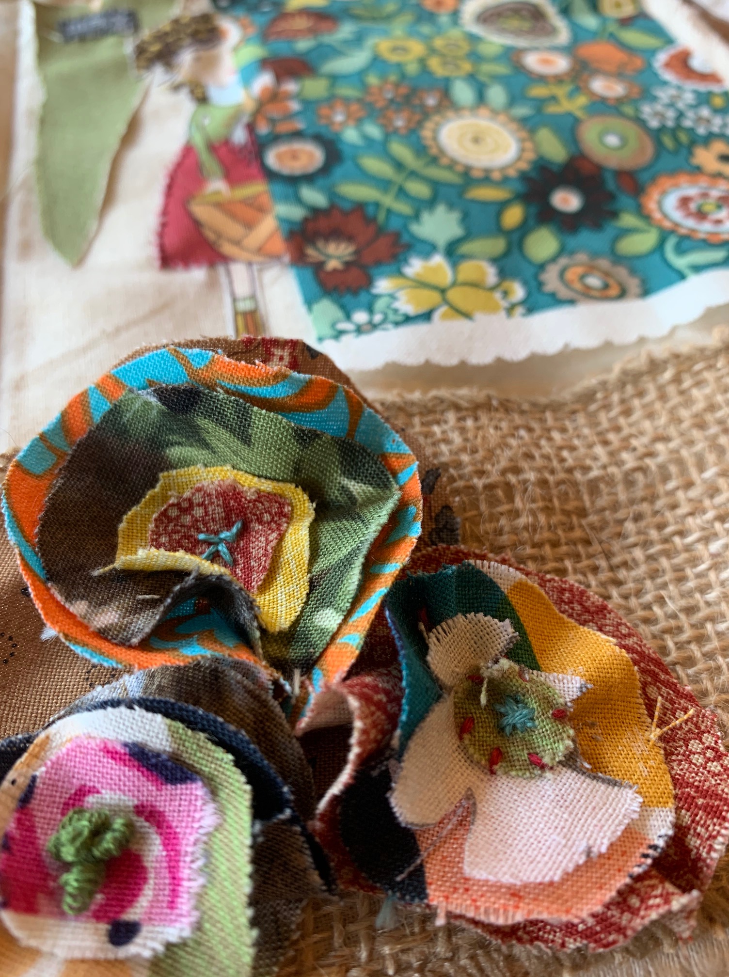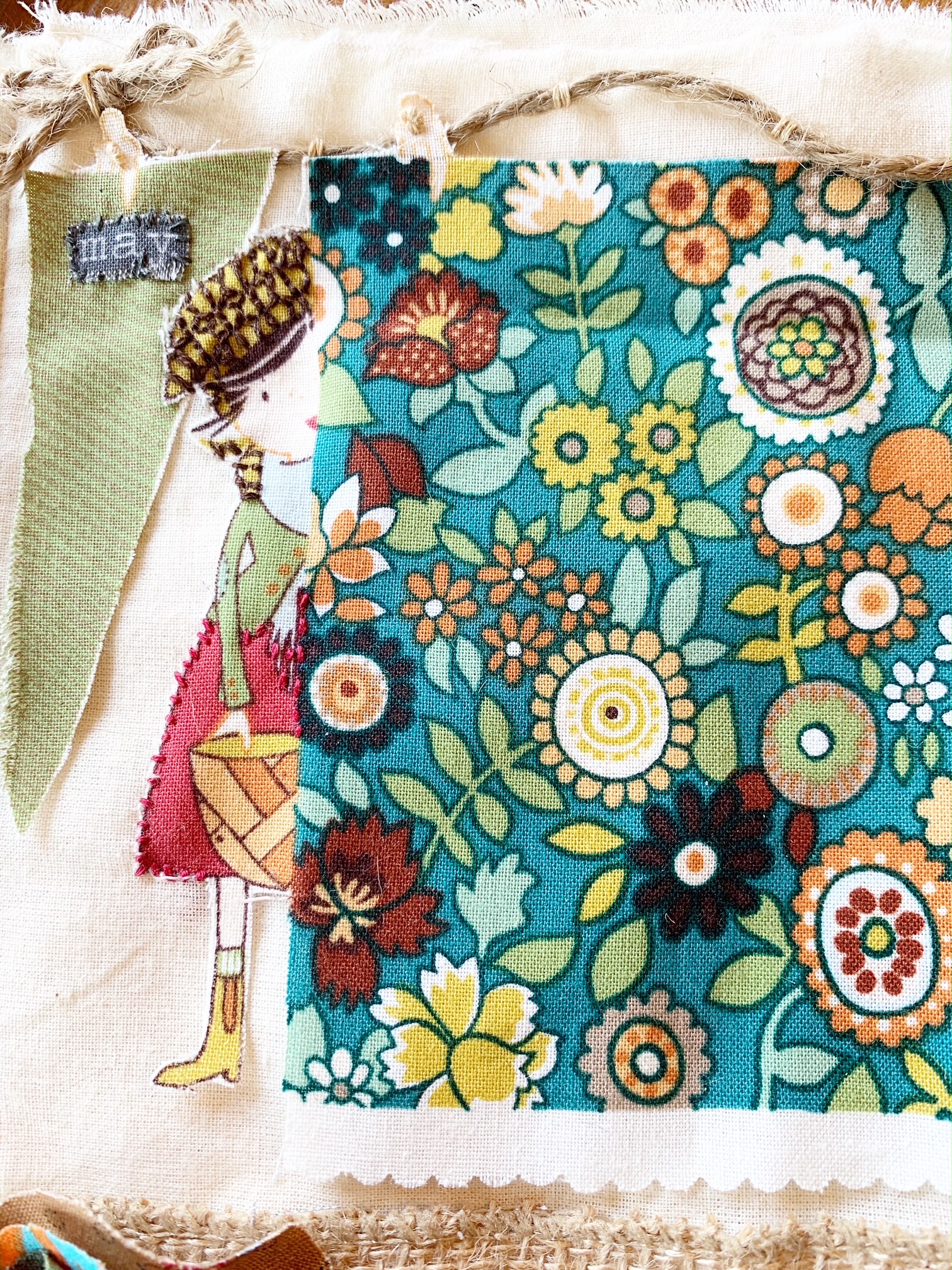 - Consider using twine and burlap as part of your onestitchamonth. I used twine to serve as a “rope to “hang” a piece of fabric. I used burlap as the backdrop for my fabric flowers and I like the contrast between the neutral burlap and the multicolor flowers.