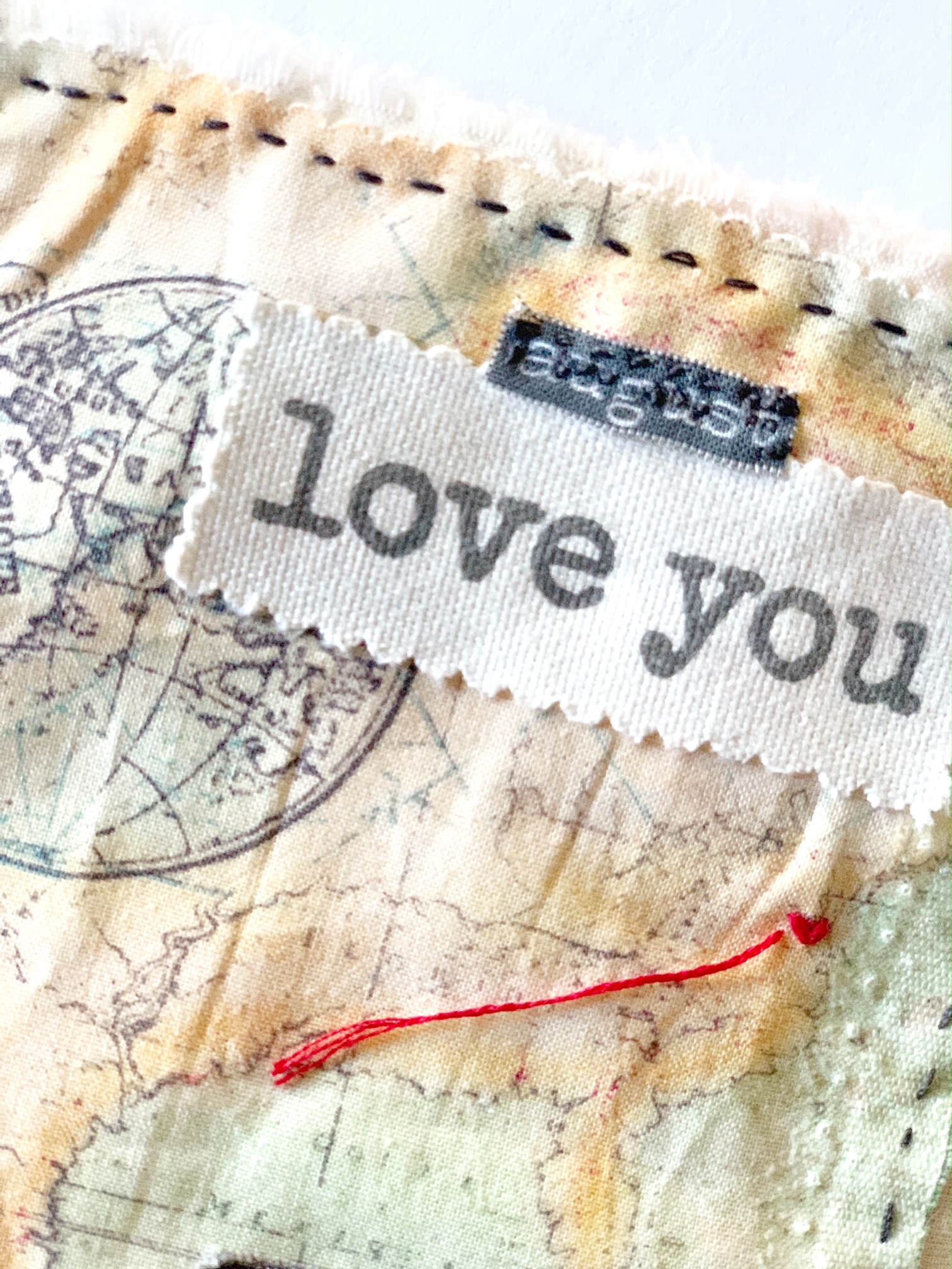 As I surveyed the fabrics and scraps that I had, my August #onestitchamonth came together. It was less about stitching and more about the textiles and what they represented. A fabric map, a piece of ribbon turned fabric tape, a scrap of non-sequential inches, and some words of advice best summed up my month.