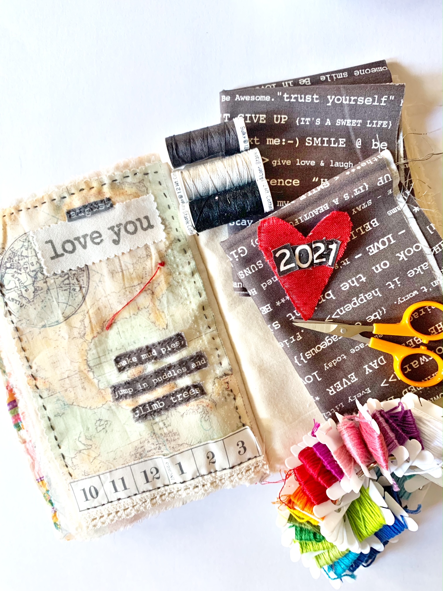 It’s a new year and my handmade stitchbook has a new page! I’ve decided to turn my fabric book into a textile mixed media journal all about 2021. Embroidery floss, fabric scraps, ribbon and more make for some inspired materials.